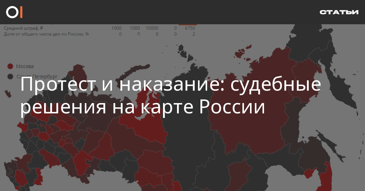 ОВД-Инфо составил карту правоприменительной практики по делам о нарушениях на митингах в российских регионах с 2011-го по первую половину 2018 года. На карте отображены решения судов первой инстанции по административным делам по статье 20.2 КоАП. На ней есть данные о количестве рассмотренных судами дел по статье 20.2 КоАП, доле обвинительных решений, среднем размере штрафа и числе таких дел на 100 тысяч жителей — для выбора данных используйте фильтр
